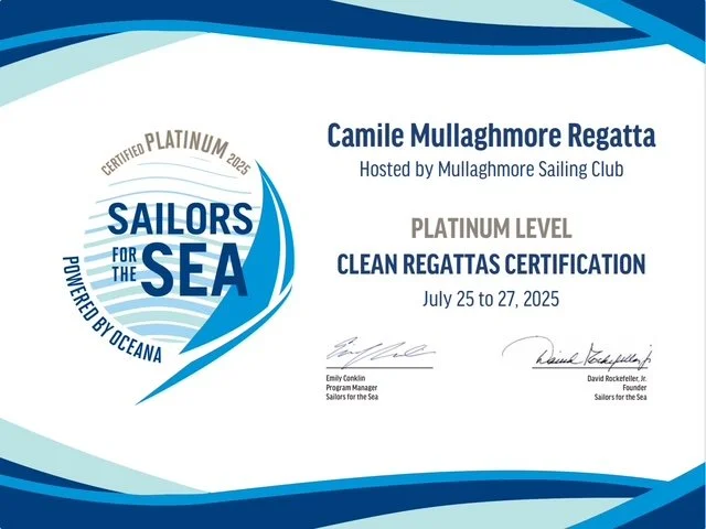 Mullaghmore Sailing Club is deeply committed to environmental sustainability and ocean health and proudly supports the Sailors for the Sea Clean Regattas Programme which is the world’s leading sustainability certification for water based events with participation across 53 countries. We were one of the first Irish clubs to take part in 2021 when we were awarded Silver Level certification. Our regatta is designed around the five sustainability themes: Elimination of Single Use Items, Environmental Stewardship, Green Boating, Community Involvement and Responsible Waste Management. Thanks to Emma Gilligan and the Green Team who have worked collaboratively across all aspects of the event to ensure every detail is aligned with the Clean Regatta principles. We have now retained Platinum Level award for the third consecutive year. You can learn more about the work behind important initiative in the Clean Regattas Programme Report 2025.